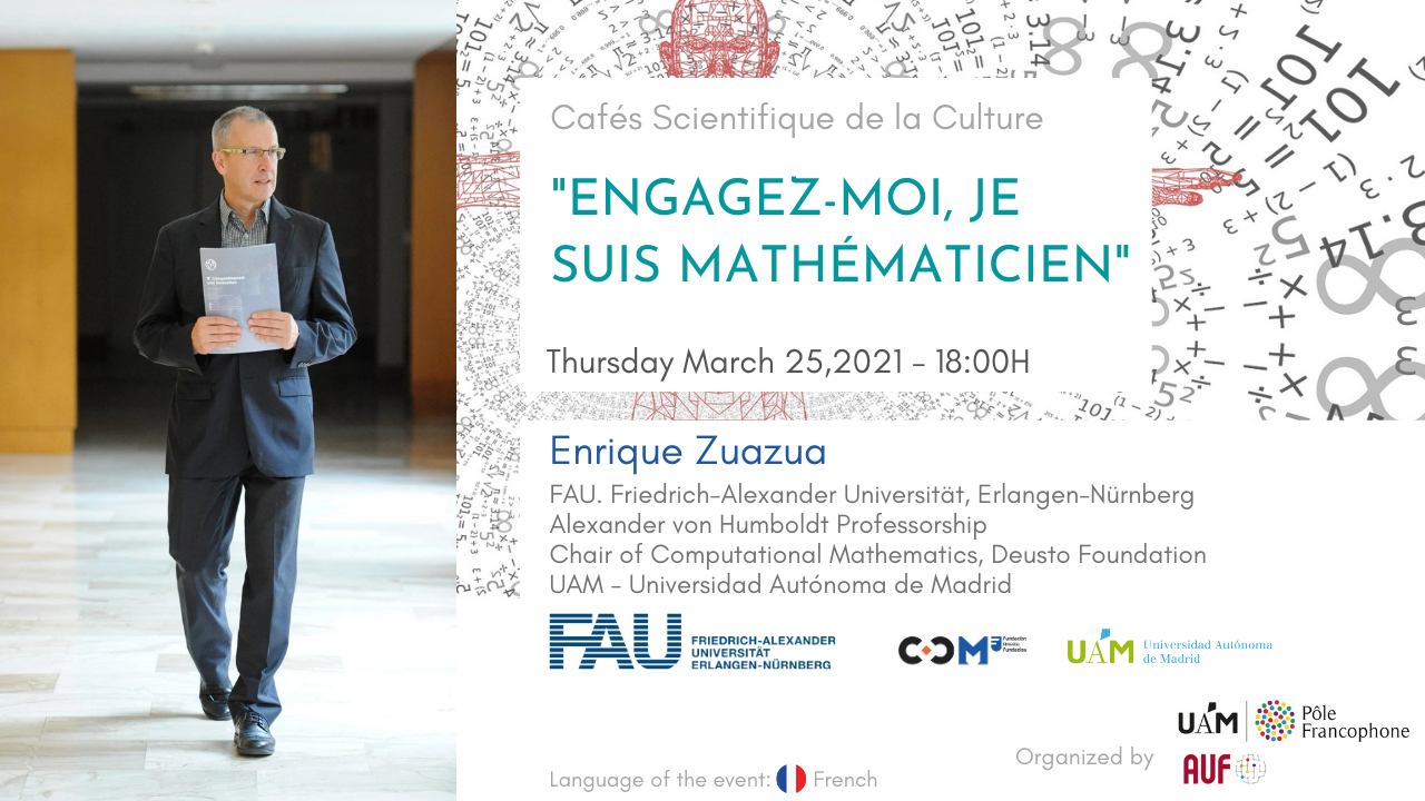 Next Thursday March 25, our Head Enrique Zuazua will be talking about “Cafés Scientifique de la Culture: “Hire me, I’m a Mathematician”” at Cafés Scientifique de la Culture an event organized by the French-speaking Pole at UAM – Autonomous University of Madrid.
