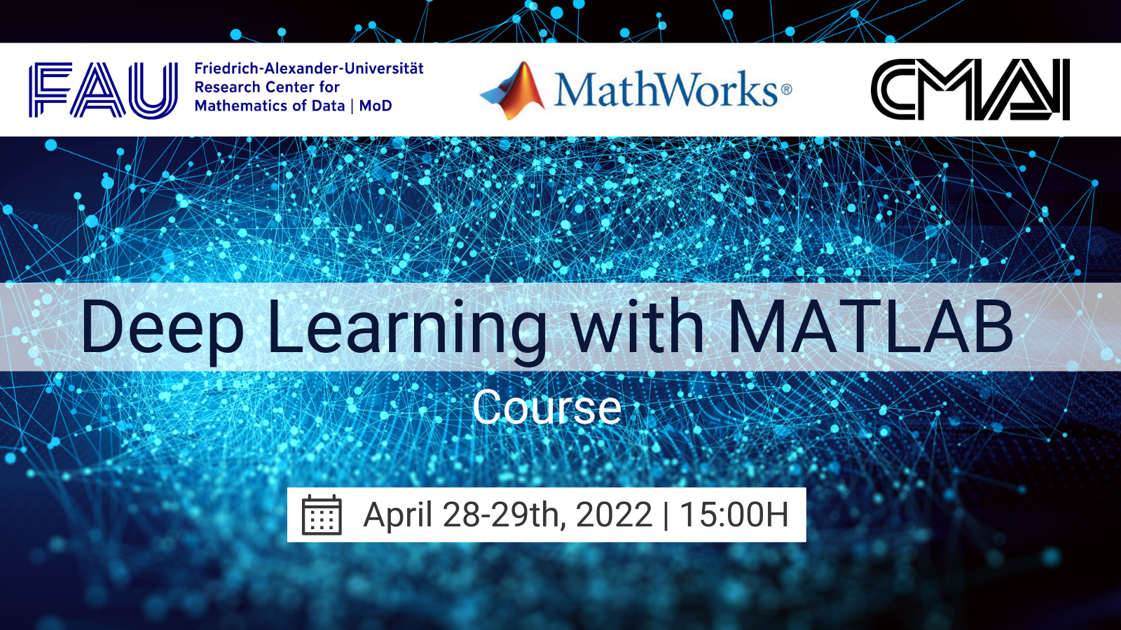 The FAU MoD Research Center for Mathematics of Data at Friedrich-Alexander-Universität Erlangen-Nürnberg, invites to the free (online) two-day course starting on April 28th, 2022 about Deep Learning with MATLAB organized by MathWorks in cooperation with FAU MoD and CMAI (Fairfax, Virginia). It includes a short MATLAB introduction w.r.t. visualization and analyzation of Data.