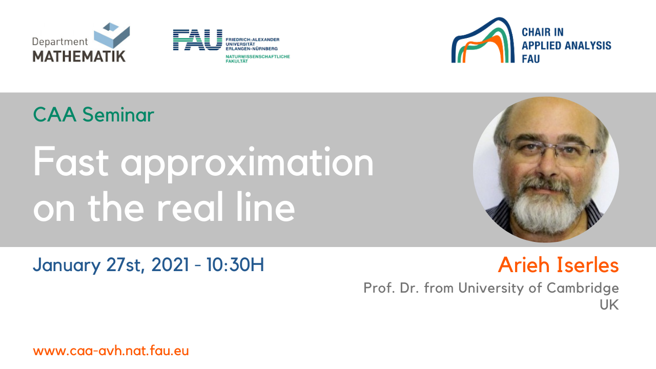 Abstract: While approximation theory in an interval is thoroughly understood, the real line represents something of a mystery. In this talk we review the state of the art in this area. Motivating our interest by the design of spectral methods for dispersive PDEs, we commence from familiar Hermite functions and move to recent results characterizing all orthonormal sets on $L_2(-infty,infty)$ that have a skew-symmetric (or skew-Hermitian) tridiagonal differentiation matrix and such that their first $n$ expansion coefficients can be calculated in O(n log n) operations. In particular, we describe the generalized Malmquist-Takenaka system. The talk concludes with a (too!) long list