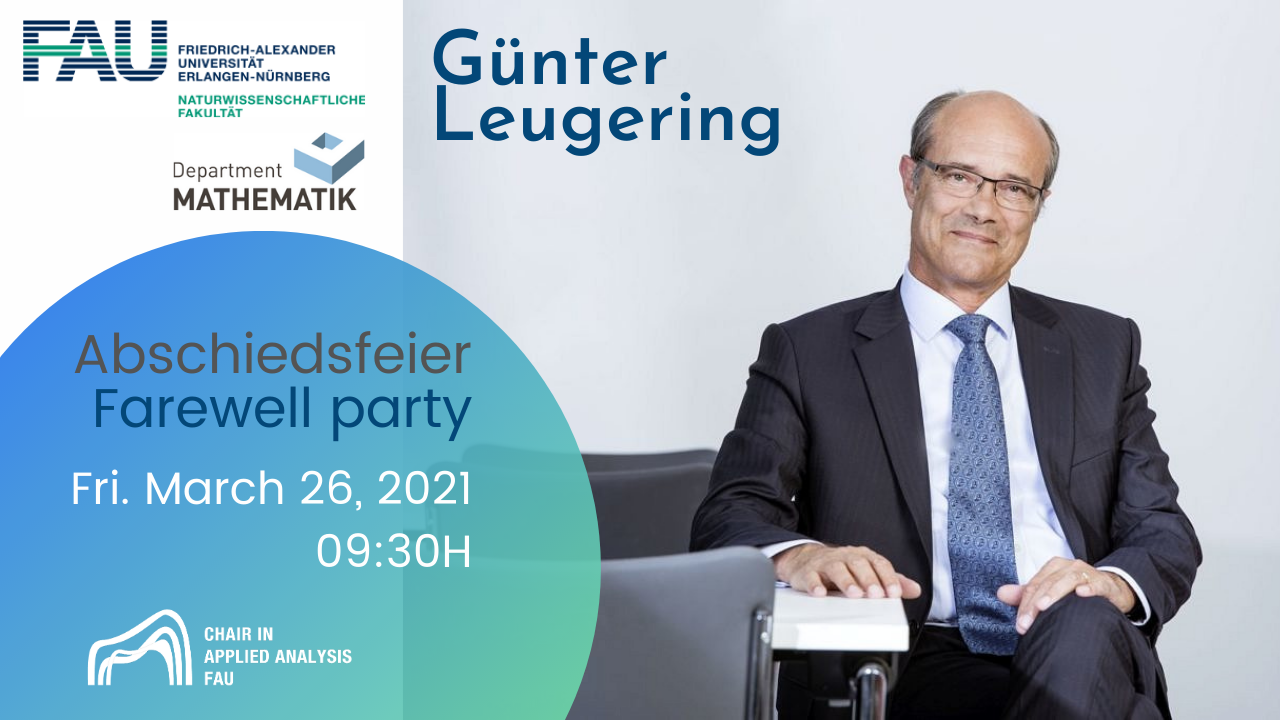 On Friday March 26 at 09:30H, our Chair represented by our Head Enrique Zuazua and our Professor Martin Gugat will be presenting special words during the farewell of Professor Dr. Günter Leugering, who is retiring after all his work on our Department of Mathematik at FAU – Friedrich Alexander Universität, Erlangen – Nürnberg (Germany).