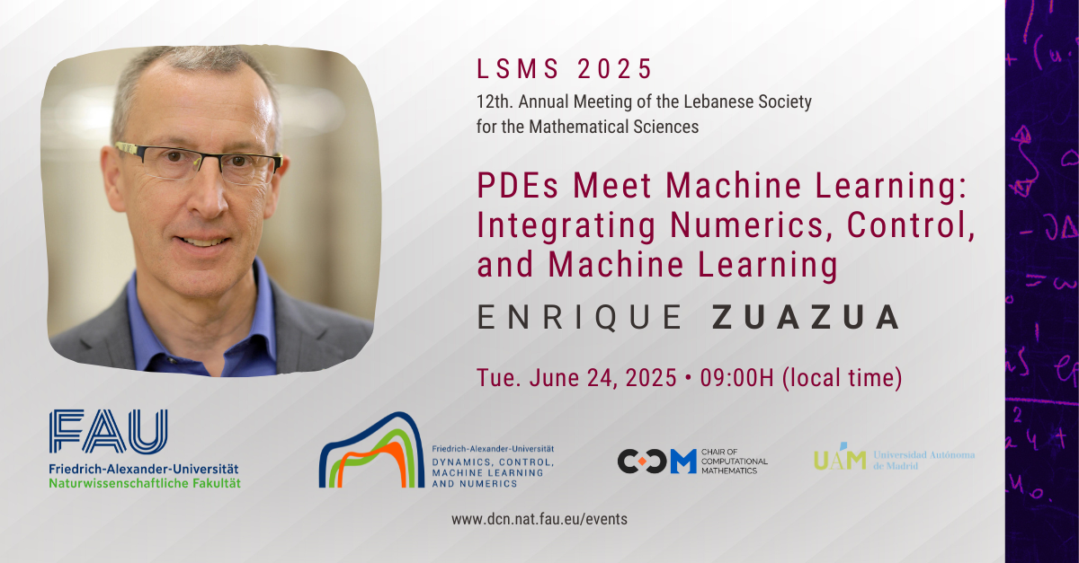 On Tuesday June 24, 2025 Prof. Enrique Zuazua will give a talk as keynote speaker on PDEs Meet Machine Learning: Integrating Numerics, Control, and Machine Learning at the LSMS 2025 conference, 12th. Annual Meeting of the “Lebanese Society for the Mathematical Sciences” held at the American University of Beirut on June 23 – 24, 2025.