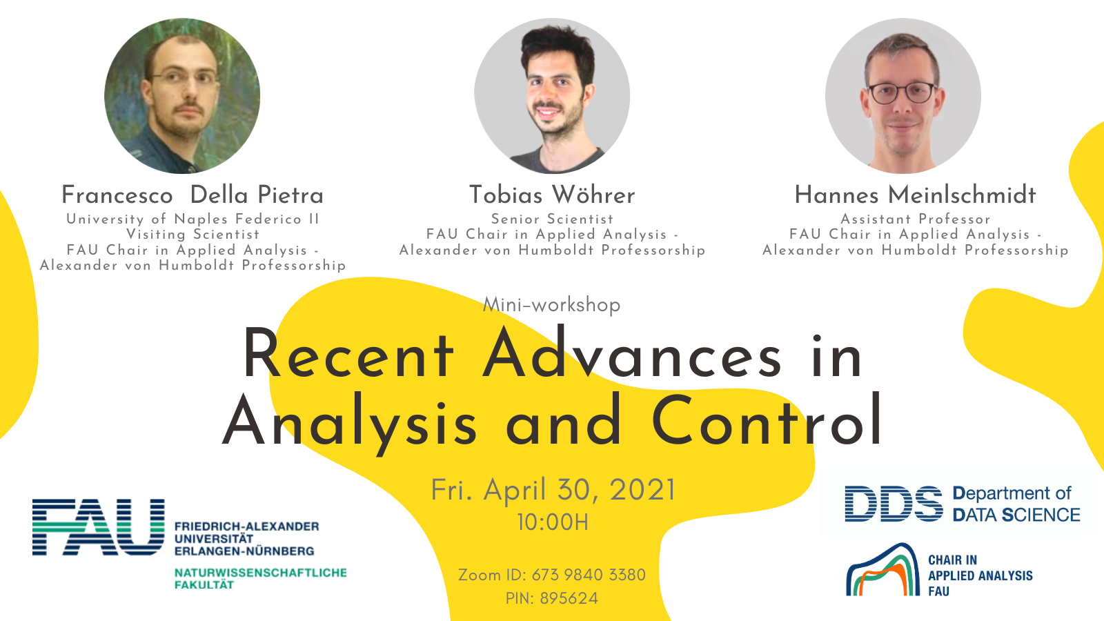 Next Friday April 30, the Chair in Applied Analysis – Alexander von Humboldt Professorship at FAU Erlangen-Nürnberg will host a mini-workshop about “Recent Advances in Analysis and Control“.