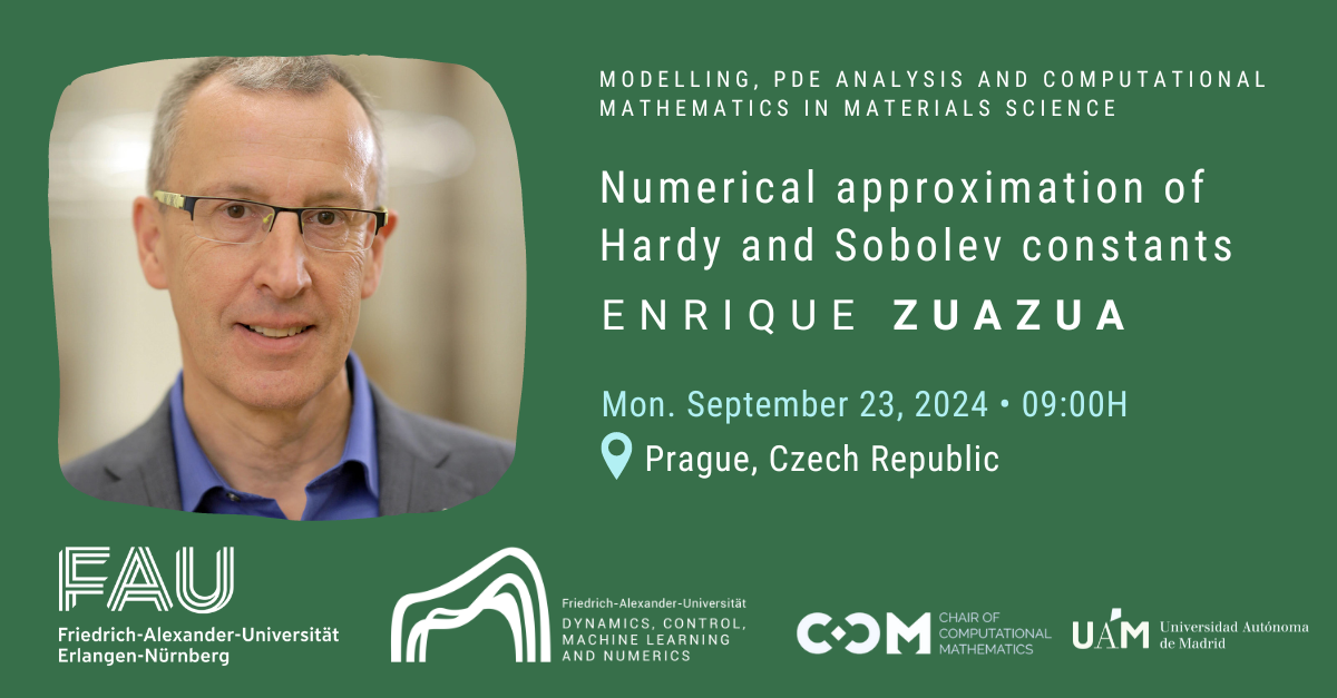 On September 23, 2024 Prof. Enrique Zuazua will talk as a plenary speaker on “Numerical approximation of Hardy and Sobolev constants” organized on September 23 – 27, 2024 at the MPDE 2024, Modelling, PDE analysis and computational mathematics in material sciences organized at the Univerzita Karlova (Charles University) in Czech Republic, Prague.