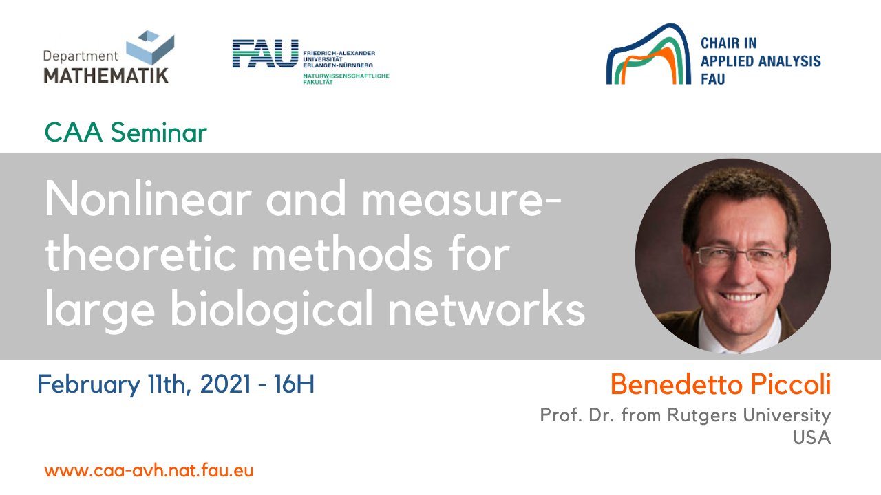 Abstract. In this talk, we will present two new techniques developed to study complex biological networks. First, we will analyze new methods for the simulation of a large biochemical network with focus on QSP (Quantitative Systems Pharmacology), virtual patient populations, and tuberculosis. The main idea is to combine knowledge from the fields of: Markov Chains, Compartmental Systems, Control Theory, and others to provide a generalize class of graphs and results on the associated dynamics. Secondly, we will describe a general framework to study reaction-diffusion