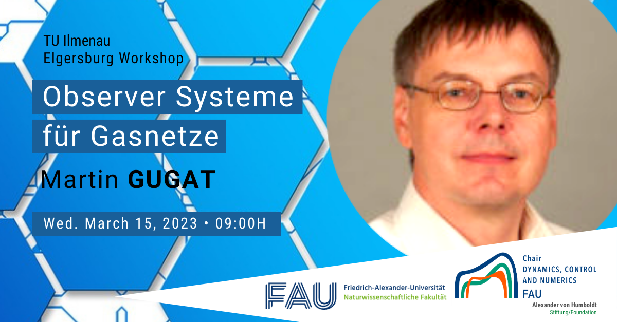 Next Wednesday March 15, 2023 our Prof. Akad. Director Martin Gugat, will talk on “Observer Systeme für Gasnetze” at the ,Elgersburg Workshop‘ at TU Ilmenau, Technische Universität Ilmenau on March 12-16th, 2023.