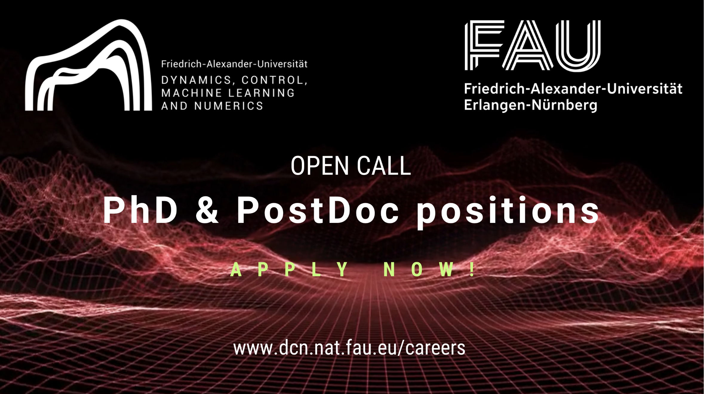 The FAU DCN-AvH, Chair for Dynamics, Control, Machine Learning and Numerics at FAU, Friedrich-Alexander-Universität Erlangen-Nürnberg (Germany) is looking for several PhD and PostDocs on the topics: