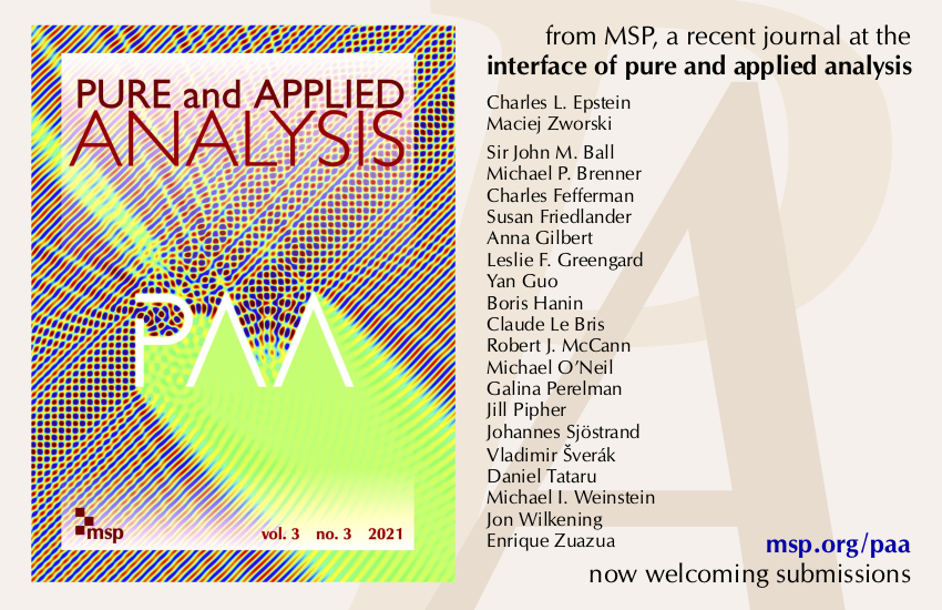 Pure and Applied Analysis is a not-for-profit journal devoted to original research at the interface of mathematical modeling, scientific computation, numerical methods and harmonic/functional analysis, partial differential equations and related subjects.