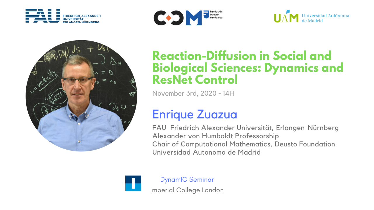 Next Tuesday November 3rd our Head Enrique Zuazua (FAU-AvH, Germany | Deusto Fundation, Bilbao | UAM, Madrid) will give a talk at the DynamIC Seminar – MA organized by the Imperial College London via Zoom about: