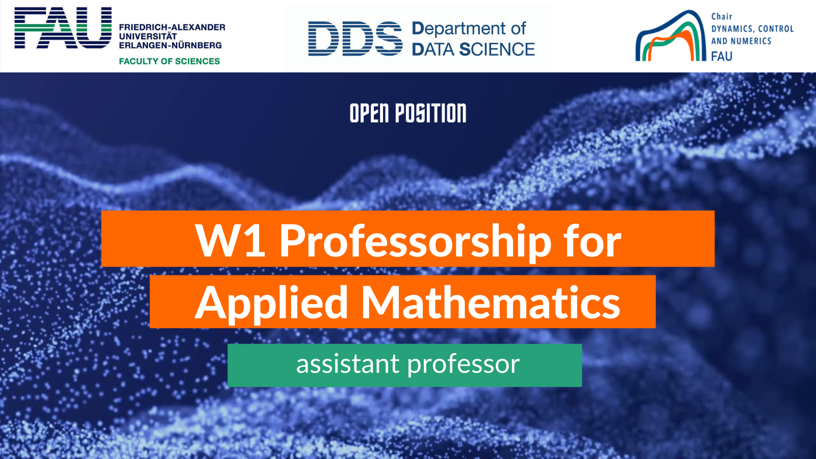 The professorship research activities should complement the Chair for Dynamics, Control and Numerics at FAU and the potential of the institution in the broad field of Applied Mathematics. Candidates are expected to have proven their skills in interdisciplinary cooperation and become actively involved in the newly established Erlangen Center for Mathematics of Data (ECMD). The successful candidate will also be expected to teach introductory and advanced lectures in applied mathematics.