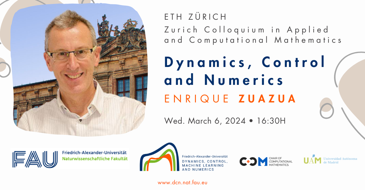 On Wednesday March 6, 2024 Prof. Enrique Zuazua will talk on “Dynamics, Control and Numerics” at the “Zurich Colloquium in Applied and Computational Mathematics” organized at ETH Zürich.